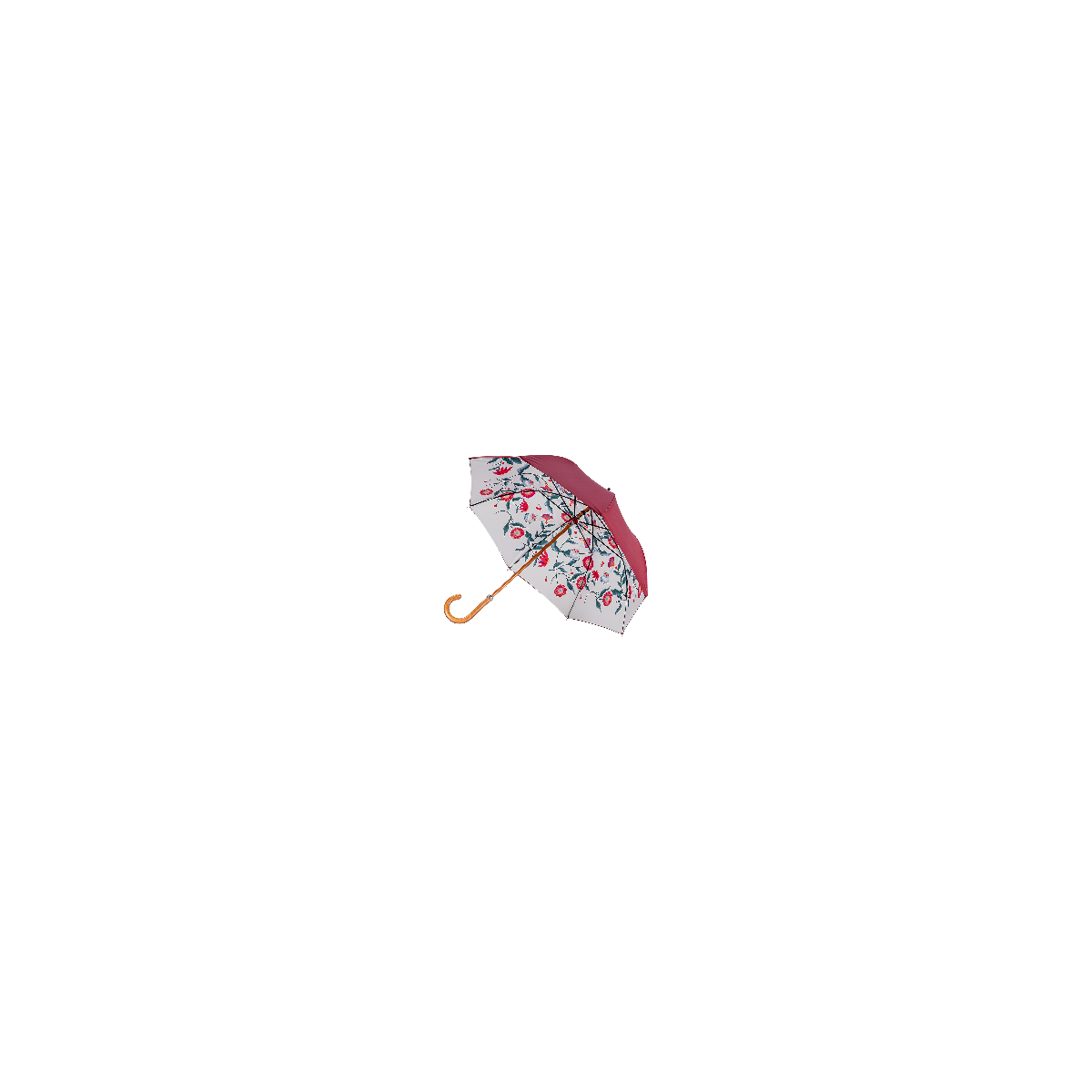 Le parapluie canne DOUBLÉ GOURMANDISE séduit par son allure extérieure sobre et élégante. Sa toile unie bordeaux offre une silhouette raffinée et intemporelle, facile à associer au quotidien. À l’ouverture, le contraste se révèle : l’intérieur du parapluie dévoile le motif GOURMANDISE, un décor floral riche et lumineux aux teintes chaudes et délicates.